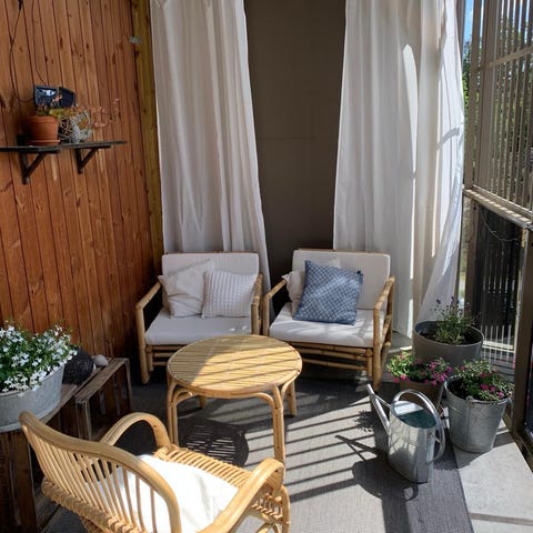 Möbelgrupp i rotting bord och stolar med blommiga dynor