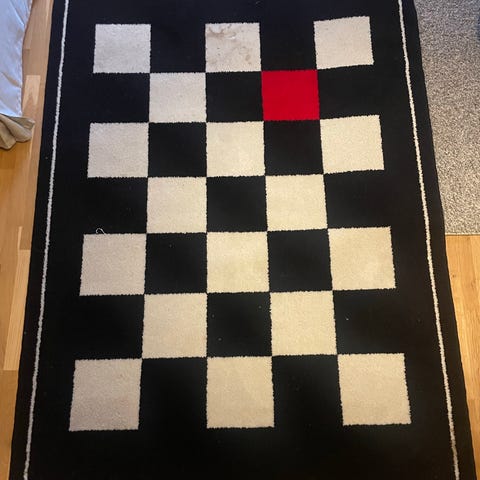 Matta med blomsterbård i rektangulär form. Mattan har gul bottenfärg med mönstrad bård i flera färger, bland annat grönt och rött i form av stiliserade blommor. Passar exempelvis i vardagsrum, hall eller kök. Material och exakta mått är okända.