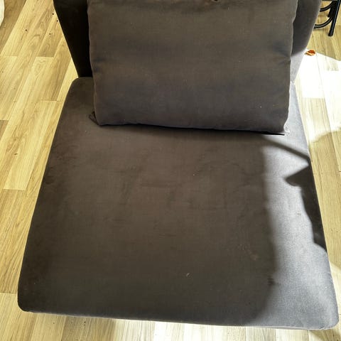 Har två stycken, kan användas som fristående fåtöljer eller sättas ihop till en soffa, två armstöd finns också.