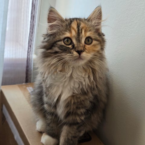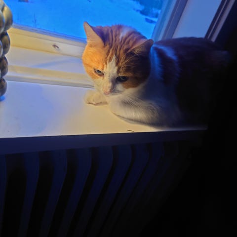 Han är en blandning mellan norsk och huskatt som behöver ett nytt hem nu för han mår inte bra att vi ökade våran familj.