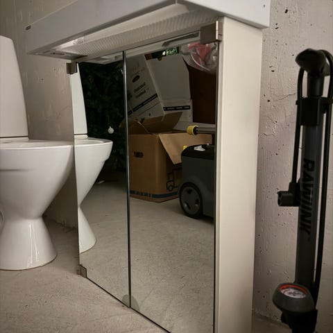 Spegelskåp för badrum i vitt utförande med integrerad belysning upptill. Skåpet har dubbla spegeldörrar och invändiga hyllplan, varav ett i glas, för förvaring av till exempel hygienartiklar och mindre badrumsprodukter. Passar för montering på vägg i badrum eller toalett där både spegel och förvaring behövs.