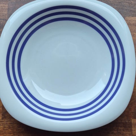 Boj tallrik, 5 stycken assietter i vitt porslin med blå kant runt ytterkanten. Klassisk färgkombination som fungerar i de flesta kök och dukningar.
