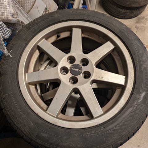 Bridgestone däck med fälgar. Kompletta hjul med sommardäck monterade på lättmetallfälgar. Däckmönster och slitbana framgår av bilderna. Passar personbil, kontrollera dimensioner och bultmönster mot din bil innan montering. Subaru Outback