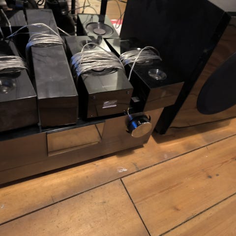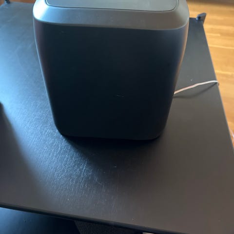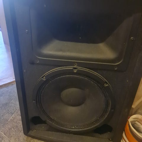 högtalare i svart utförande. Systemet på bilderna visar en Sonos-enhet ansluten till ett PA-system med mixer och aktiva högtalare. Sonos-enheten kan användas för att strömma ljud till anläggningen via nätverk. Högtalaren och tillhörande utrustning har flera anslutningar för ljudkällor och kan användas för exempelvis musikuppspelning eller tal i mindre till medelstora lokaler, beroende på hur säljaren väljer att konfigurera systemet. Alla kablar och anslutningar som syns på bilderna ingår enligt säljarens uppgift.
