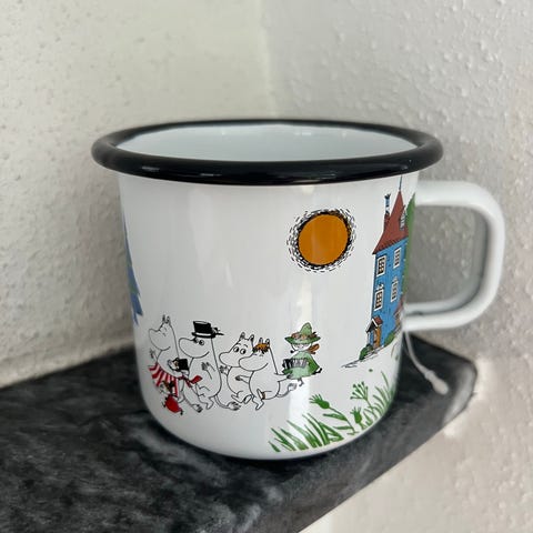 Oanvänd plåtmugg, vit med svart rand runt kanten. Svart text.