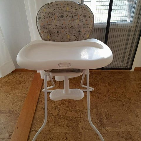 Graco matstol för barn. Hopfällbar modell med vit bricka, grått fotstöd och vit/grått mönstrat tygsäte. Utrustad med säkerhetssele och stabil metallstomme med böjda ben. Passar för matstunder i hemmet och kan enkelt fällas ihop för förvaring eller transport. Finns i Hammarby sjöstad.