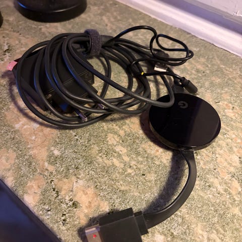 Google Chromecast mediaspelare i svart utförande. Enheten ansluts via HDMI till TV. Används för att strömma ljud och bild trådlöst från kompatibla enheter som mobil, surfplatta eller dator till TV eller annan bildskärm som har HDMI-ingång.