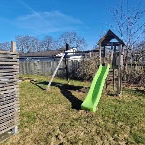 Lekställning i trä med två gungor, klätterdel och grön rutschkana. Konstruktionen består av en ställning med gungor samt en upphöjd plattform med räcken och rutschkana ned till marken. Passar för utomhuslek i trädgård för barn i olika åldrar. Monteras fristående på plan yta utomhus.