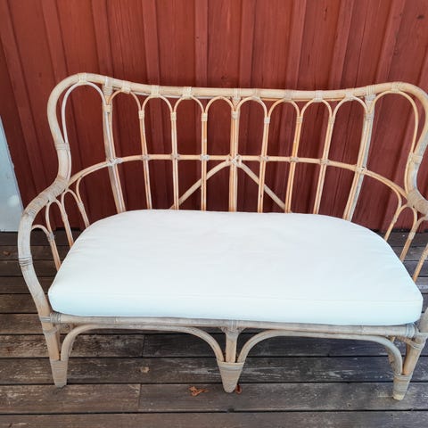 Bänk i trä och metall med tre sittdynor. Dynorna är tuftade och i turkos och rosa färg. Passar exempelvis på altan, uteplats eller i trädgård som sittplats för flera personer.