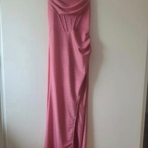 Röd klänning med smala axelband och rynkad design. Slits baktill.. Stretchigt tyg.