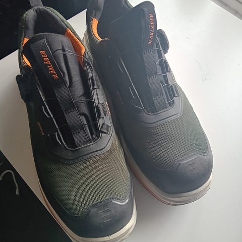 Blåkläder 2451 skyddsskor i storlek 44. Skorna är svarta med grå detaljer och är utformade som låga skyddsskor. De har skyddande tåhätta och sula anpassad för arbete i miljöer där säkerhetsskor krävs. Modellen är avsedd för yrkesbruk inom till exempel bygg, industri eller lagerarbete, där foten behöver extra skydd och stabilitet.