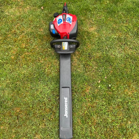 Häcksax med blått handtag. Utrustad med tandad skärdel för klippning av mindre grenar och buskar. Passar för trädgårdsarbete som formklippning av häckar och buskage.