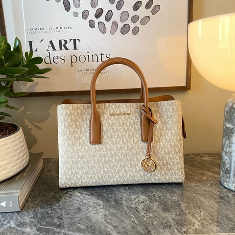 Michael Kors handväska för kvinna i brun och beige färg. Väskan har dubbla axelremmar och ett mönstrat frontparti med Michael Kors-loggor. Tillverkad i övrigt material. Passar för vardagsbruk och som axelväska där det finns plats för plånbok, mobil och andra personliga tillhörigheter.