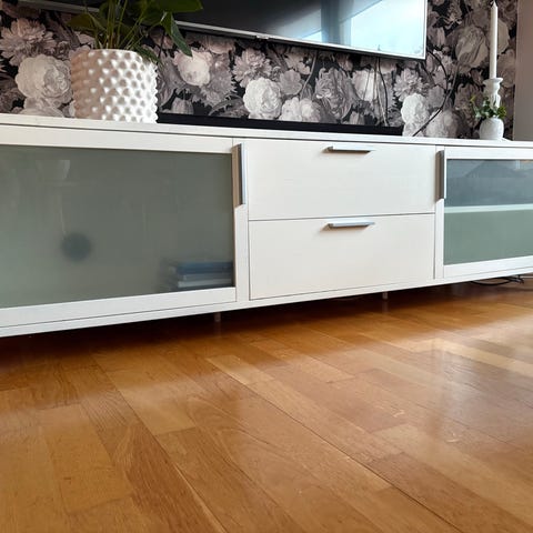 Säljer en modern och stabil TV-bänk med elegant design och glasskiva på toppen. Väldigt välskött och känns nästan som ny – inga repor på glaset.