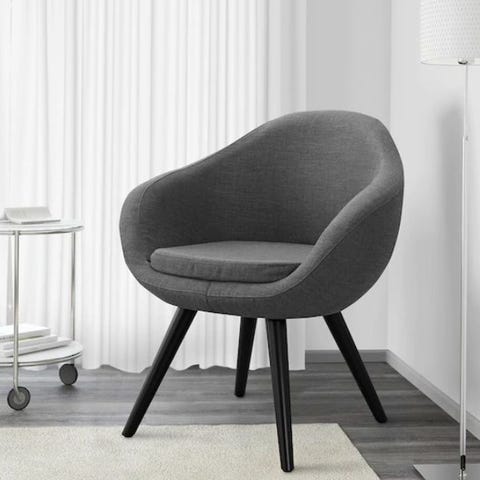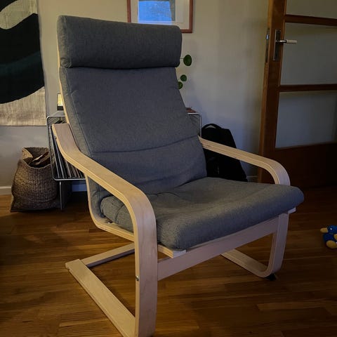 IKEA fåtölj med grå klädsel och böjd träram. Fåtöljen har hög rygg med huvudstöd och stoppad sits för sittkomfort. Klädseln är i tyg och ramen i ljust trä med svängd form. Passar som sittplats i vardagsrum, sovrum eller läshörna. Designern är Yrjö Kukkapuro.