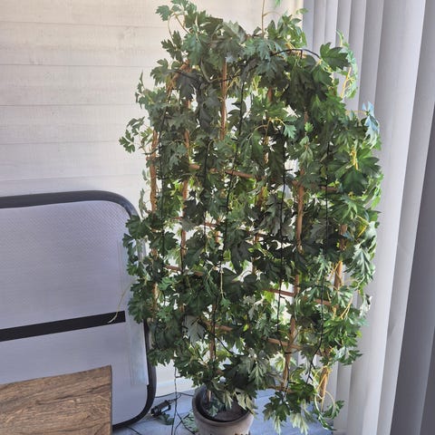 Grön konstgjord häck på expanderbart galler. Häcken består av ett rutnät i trä eller plast med fastsatta konstgjorda blad i gröna nyanser. Passar för avskärmning, insynsskydd eller dekoration på balkong, uteplats, trädgård eller inomhusmiljöer. Nätet kan dras ut eller fällas ihop för att anpassa storlek efter utrymme och kan fästas mot exempelvis räcke, vägg eller staket.