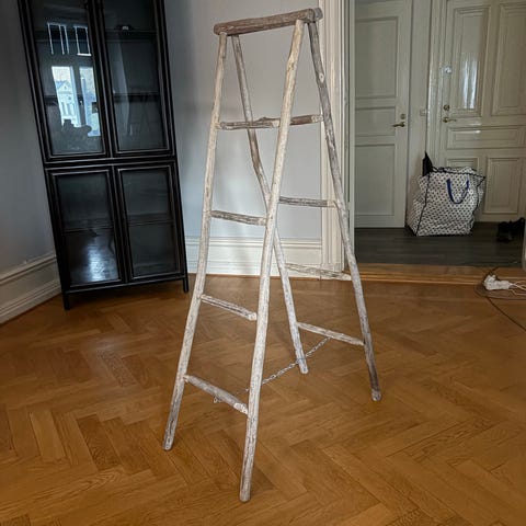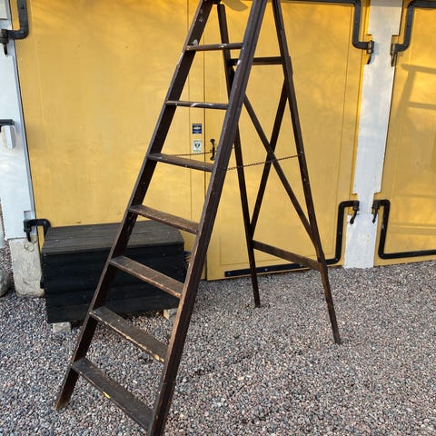 Gammal stege i trä med fin patina. Den funkar id test att klättra upp på men rekommenderar ändå att ha som dekoration/inredning.