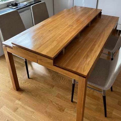 Fint och stabilt ekbord med plats för 4-6 personer. Har en klaff på ena sidan som går att fälla upp. Blir 165 cm lång i uppfällt läge. Säljs tillsammans med 6 tillhörande stolar i fint skick. En av stolarna har en liten skada på dynan, se de två sista bilderna.