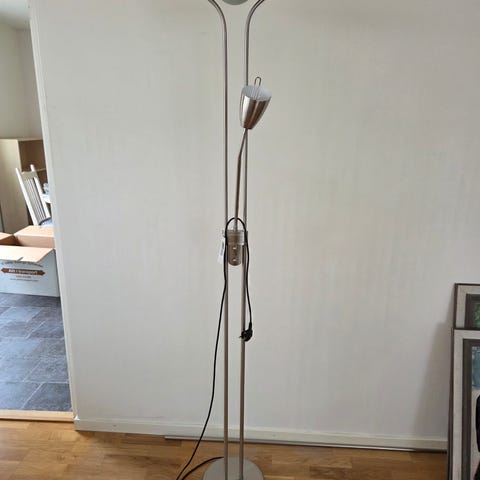 Golvlampa från IKEA, fungerar fint, en del av den större lampskärmen är knäckt.