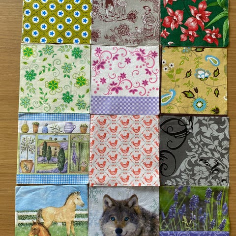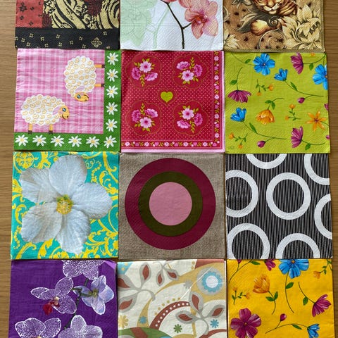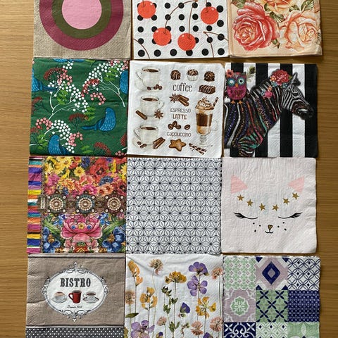 Ett set med tolv trelagers pappersservetter. Servetter i papper med blandade motiv. Setet innehåller flera olika mönster, bland annat blommor, fjärilar, kaffe, grafiska mönster och andra dekorativa tryck. Passar till dukning, pyssel eller decoupage. Flerfärgade servetter i standardstorlek för engångsbruk.