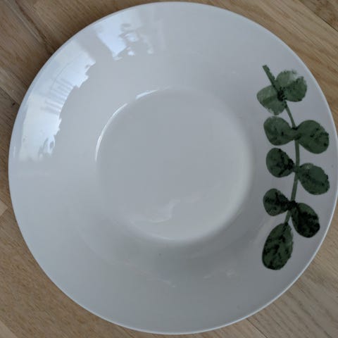Jag säljer nu en Djup tallrik i vitt porslin med blå dekor längs kanten. Passar för servering av soppa, pasta eller gryträtter. Klassisk rund form med något upphöjd kant.
