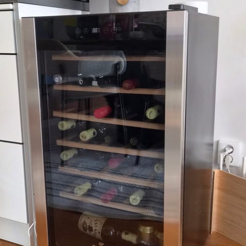 Säljer en stilren vinkyl från Caso, modell WineComfort 66 (CS660) i bra skick. Modern design i rostfritt stål med hyllor i ljust trä och UV-skyddad glasdörr.