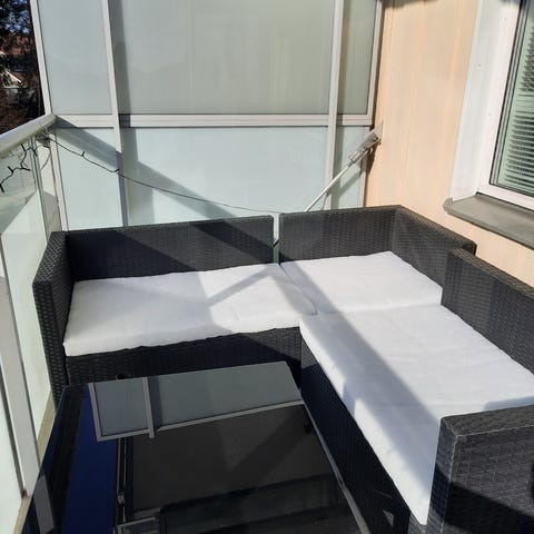 loungesoffa med tillhörande bord. Soffan består av flera sektioner som kan ställas ihop till hörnsoffa eller separata sittdelar. Stommen är mörk och dynorna är vita med svarta ryggkuddar. Passar för uteplats, altan eller balkong. Bordet har plan ovansida som kan användas som avställningsyta. Säljs som komplett grupp med soffdelar, dynor och bord enligt bilder.