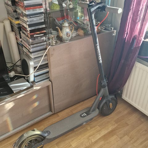 Bakdäcket wobblar lite men det påverkar inte körningen. Scootern har stått ett tag i källaren eftersom laddaren gått sönder.