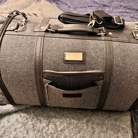Eastpak transportväska för husdjur i grått och svart tyg med fiskbensmönster. Väskan har bärhandtag upptill samt justerbar axelrem med axelvaddering. Sidorna har nätpaneler för ventilation och insyn, samt dragkedjor för öppning. Invändigt finns fäste för koppel eller sele. Utsidan har mindre fickor för tillbehör. Lämplig för transport av mindre husdjur, till exempel katt eller liten hund, vid resor och kortare transporter.
