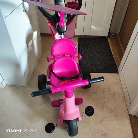 Det går bra att använda den som trehjuling eller plocka bort pedalerna och använda den som springcykel man kan justera bredden/ avstånd på bakhjul för mer stabilitet. Nästan ny skick.