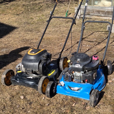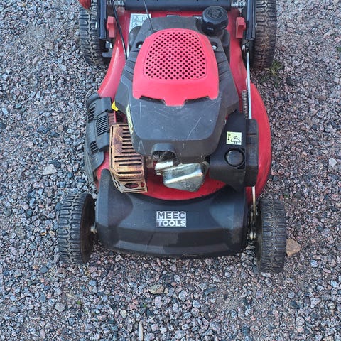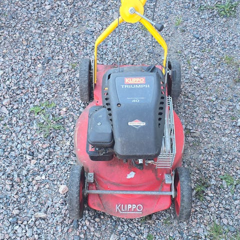 Gräsklippare från Biltema. Lätt att starta och fungerar okej. Motorn varvar upp och ner lite – den har inte servats ännu. Bränslelocket är trasigt, och en provisorisk lösning har använts för att lösa problemet.