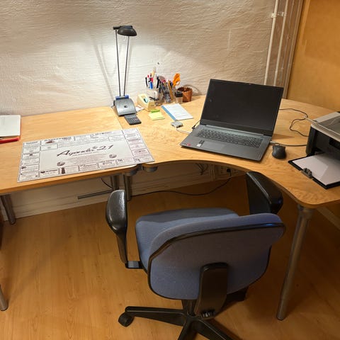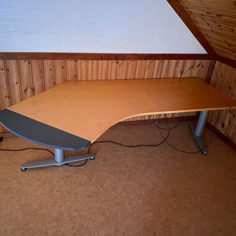 Höj- och sänkbart hörnskrivbord med svart metallunderrede och skiva i träfaner. Bordet har en utskuren arbetsyta som ger plats för stol och ben samt extra arbetsyta åt båda sidor. Till skrivbordet hör en fristående hurts med flera lådor i matchande träutförande. Separat sidobord 60x80 cm. Passar som arbetsplats i kontor eller hemmakontor med behov av stor bordsyta och extra förvaring. Kontrollen något defekt men det går bra att höja och sänka skrivbordet.