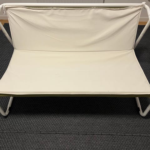 Beige trädgårdssoffa med stomme i metall och sits/rygg i nätväv. Vädertålig konstruktion med lättskött yta som kan torkas av vid behov. I mycket gott skick (inköptes förra sommaren). Bredd ca 100cm. Finns att hämta i Saltsjöbaden.