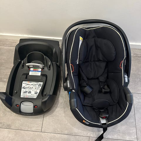 Britax Römer babyskydd bilbarnstol för barn upp till cirka 13 kg. Modellen är ett bakåtvänt babyskydd som monteras i bilen tillsammans med basenheten som syns på bilden. Bilbarnstolen har bärhandtag och är utrustad med internsele.