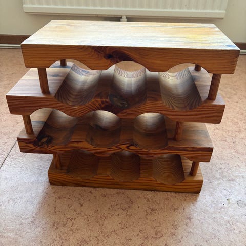 Vinställ i mörkbrunt trä och metall. Stadigt. Rymmer 9-12 flaskor.
