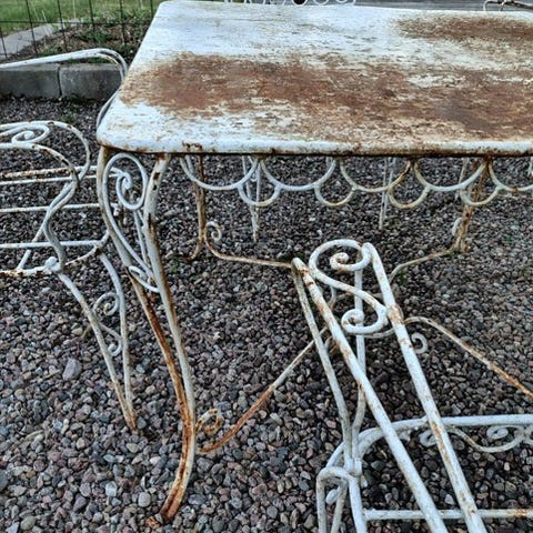 Blomsterbord i metall med glasskiva. Bordet är rektangulärt med dekorativ kant runt ovansidan och smala ben. Metallstativet är målat i vitt och ovansidan består av en genomskinlig glasskiva. Passar för placering av krukväxter eller dekorationer inomhus eller på skyddad uteplats. Mått enligt bild med måttband, längd cirka 60 cm.