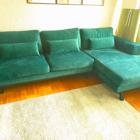 En otrolig soffa som tar emot att sälja, men behövs pga flytt. Sammetstyg som är lätt att underhålla, där fläckar går att torka bort direkt och lämnar inget märke. Den är riktigt skön att sitta i och djupet på sitsen gör att det är lätt att mysa ner sig. Är i fint skick trots att den har några år på nacken.