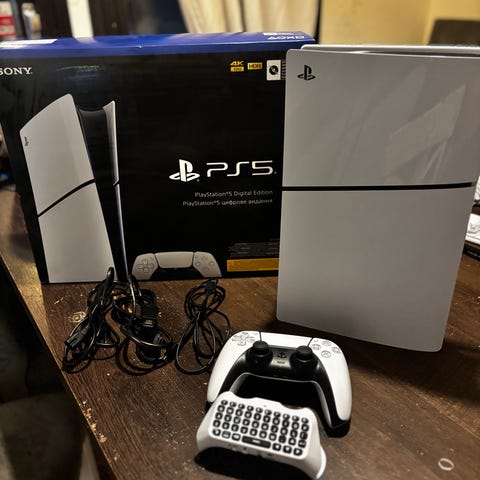 Sony Playstation 5 spelkonsol i vit färg. Konsolen är avsedd för spel, film och annan underhållning. Bilden visar en handkontroll och ett tangentbordstillbehör placerade ovanpå konsolen. Eventuella tillbehör som syns på bilden kan ingå eller inte ingå beroende på säljarens uppgifter.