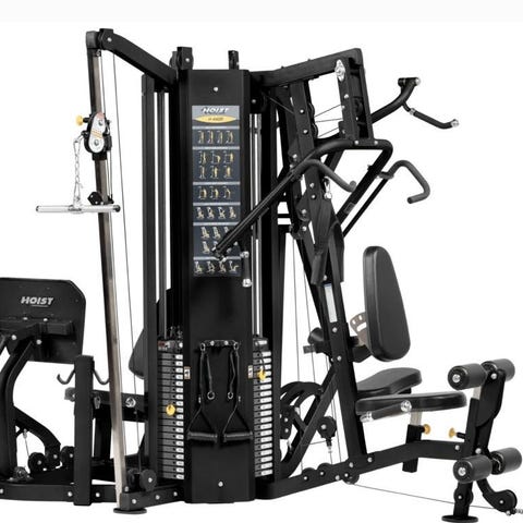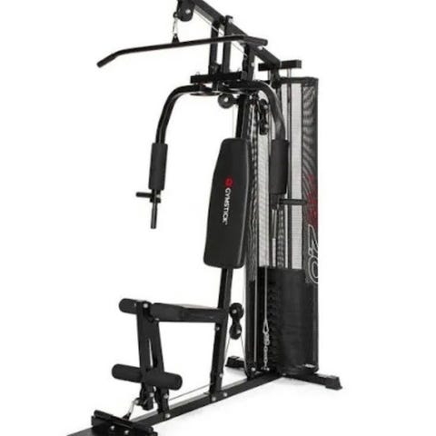 Multigym och träningsbänk för hemmagym i svart färg. Utrustningen består av ett multigym med viktmagasin, dragstation och flera träningsstationer för över- och underkropp samt en justerbar bänk med skivstångsställning. Passar för styrketräning av bland annat bröst, rygg, ben, axlar och armar. Setet kan användas med lösa viktskivor och skivstång enligt bilderna, för övningar som bänkpress, knäböj, bensträck, rodd och olika dragövningar. Lämmar sig för träning i hemmagym eller mindre träningsrum.