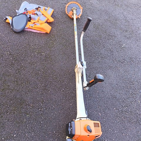 Startar och går som den ska. Maskinen är avsedd för röjning av gräs, sly och lättare skogsarbete. Levereras med sele och klingskydd enligt bilderna.
