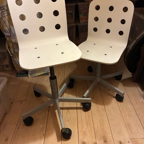 Höjden på stolen är ca 53 cm och sittdynan ca 30*25 cm, perfekta för barn!! 100kr för båda stolarna.