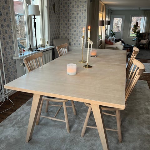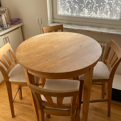 Vitlaserat ekbord som vi specialdesignat själva. I superfint skick och går att slipa och lacka om, om man vill. Endast matbordet säljes, inte stolarna.