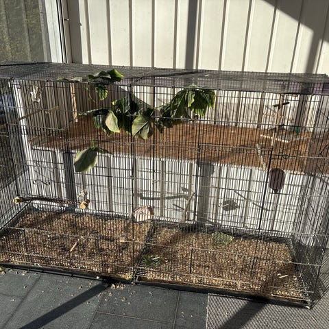 Fågelbur på ställning med hjul i metall. Buren har galler runtom med öppningar på sidorna och framtill. Den står på ett fristående stativ med fyra hjul för enkel förflyttning. I botten finns en utdragbar bricka för enklare rengöring. Passar för inomhusbruk till mindre och medelstora burfåglar, beroende på mått och inredning som sätts i buren.