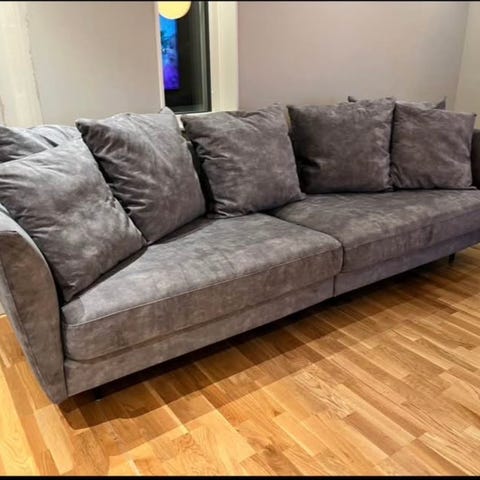 Ikea soffa med schäslong i grått tyg. Soffan har tre sittplatser och en schäslongdel för extra benutrymme. Rak modell med breda armstöd och lösa ryggkuddar. Klädsel i mörkgrå textil och ben i mörkt trä. Formgiven av Aage Petersen och passar i vardagsrum eller liknande sällskapsytor.