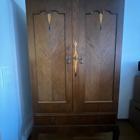 Säljer ett äldre skåp från troligen 1920-talet. Skåpet har två dörrar varav bakom finns 3 flyttbara hyllplan. Under dörrarna finns två lådor.