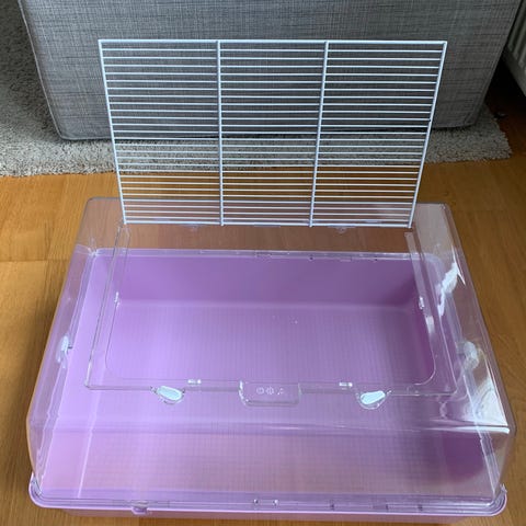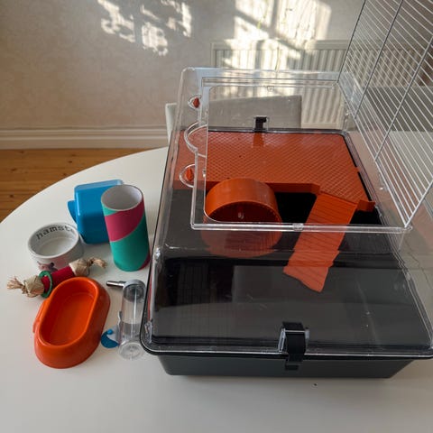 Som ny. Hamsterbur med tillbehör såsom hus, sandbad, vattenflaska. Mycket gott skick. I köpet ingår "tillbyggnad" (Ikea låda) om önskas där köparen kan köpa till rör för att bygga ihop med extra yta.