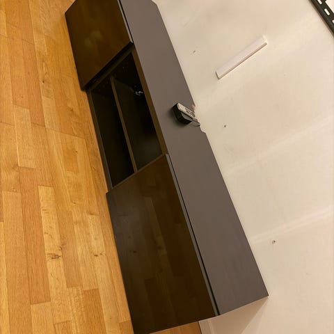Tv-bänk i träfaner med svart metallunderrede. Möbeln är cirka 180 cm bred och 40 cm djup enligt ritningen. Bänken har två dörrförsedda förvaringsutrymmen på sidorna samt öppna hyllplan i mitten för exempelvis mediautrustning, spelkonsoler eller annan elektronik. Passar för placering av tv och som förvaringsmöbel i vardagsrum eller tv-rum.