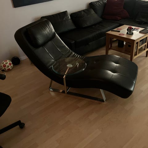 Fin fåtölj eller vilstol i Le Corbusier-modell (ej orginal). Helhetsintrycket är gott även om det finns några små saker att anmärka på. Se bild två och tre för exempel på skavanker, ingenting man tänker på men de finns där.