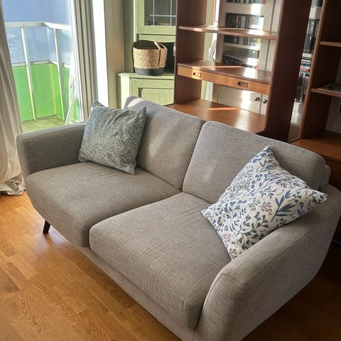 Ljusgrön 2-sitssoffa. Kuddar i polydun. Inga skador men lite blekt i tyget. Tyget kan tas av och tvätta på kuddarna. Mått djup 80cm bredd 150cm.