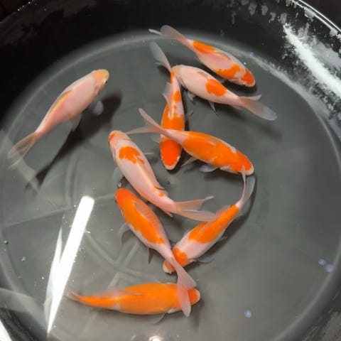 Alla tre fiskar är importerade från Japan, har under förra sommaren gått ute i dammen och vintern har spenderats inomhus i 18°.